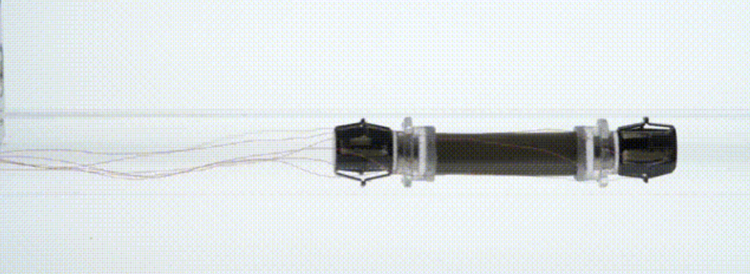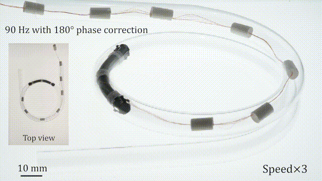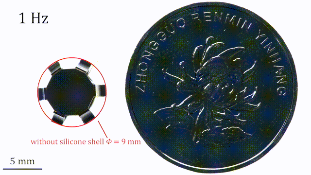 此外,这个基于高频蠕动运动原理的管道机器人由外部的缆线来提供动力,在亚厘米大小的管道中实现了水平和垂直快速运动(速度:1.19身长 / 秒)。