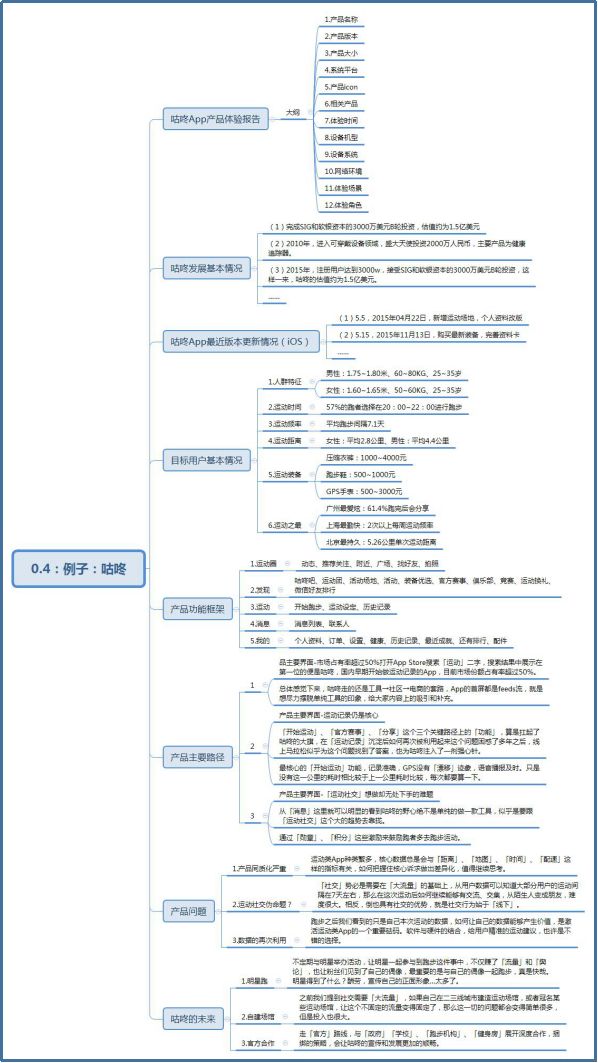 该环节,LiSten老师以咕咚App产品体验报告为案例从基本情况、最近版本更新情况、目标用户基本情况、产品功能框架、产品主要路径、产品问题、咕咚的未来等方向展开分析: