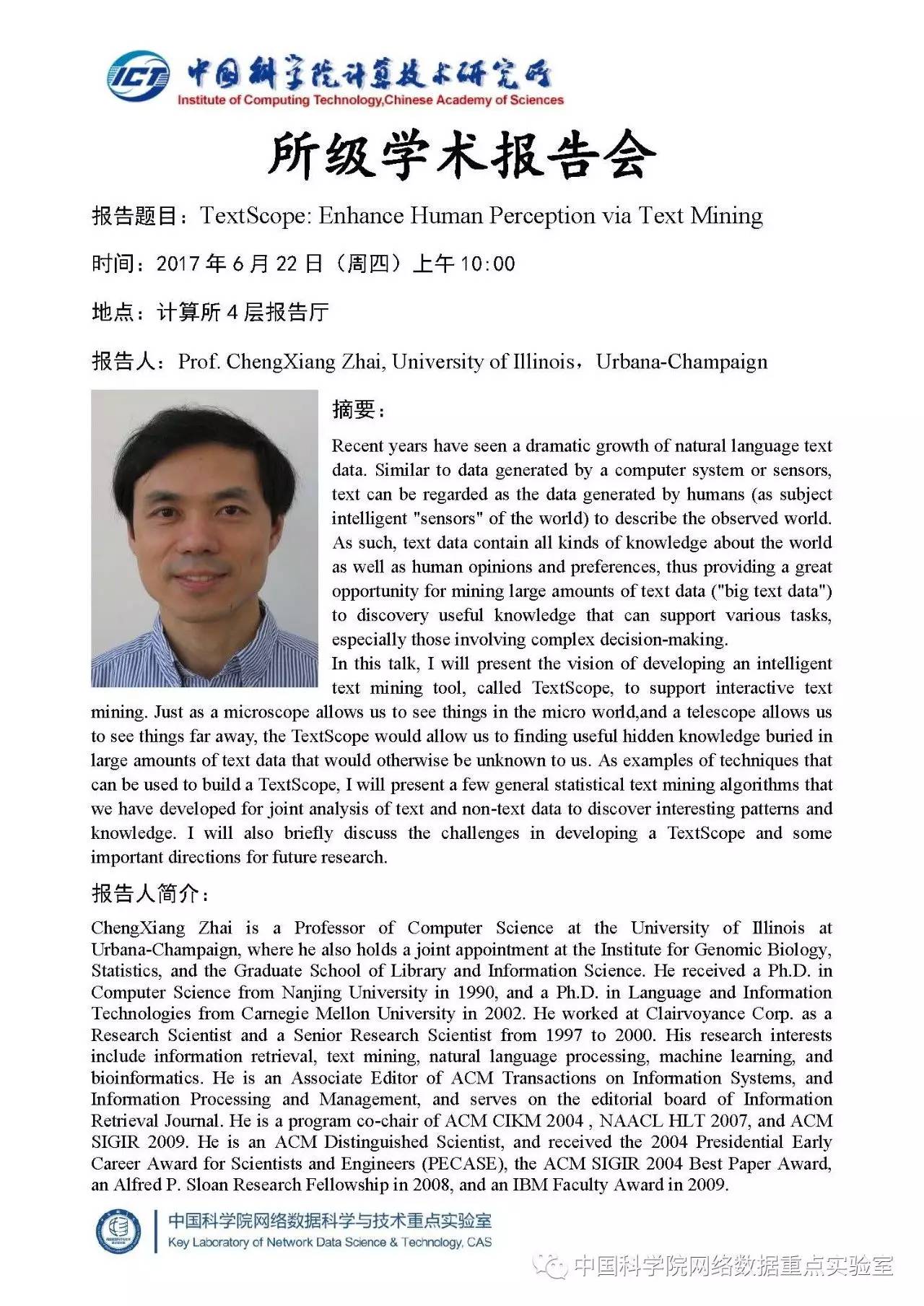 翟成祥教授现在美国伊利诺大学香槟分校(UIUC)计算机系教授,并同时在该校的生物信息研究所,图书馆信息科学系,及统计系任兼职教授。翟教授主要从事信息检索,大规模信息管理研究与开发,已获得多种奖励,包括2004年度美国国家科学基金会的青年科学基金奖(NSF CAREER),2004年度美国青年科学家和工程师最高荣誉总统奖(PECASE),2008年度斯隆学者奖,2009年度ACM杰出科学家奖,2004年ACM SIGIR最佳论文奖,2011年ACM CIKM最佳学生论文奖等。翟教授的主要研究成果包括开发新型信息检索模型,个人化信息检索技术,自动文本信息抽取技术,及生物信息分析算法,部分研究成果正在向产品转化。翟教授与计算所也有着多年的合作,2008年他担任了计算所牵头组织的龙星计划课程的讲师,为学员们开了“Introduction to Text Information Systems”的课程,获得了一致好评。他目前与程学旗研究员联合组织WSDM 2015国际会议.
