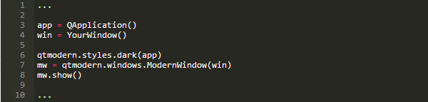 为了使用qtmodern,只需将你想要的样式应用到应用程序,然后创建ModernWindow把你想modernize的窗体括起来: