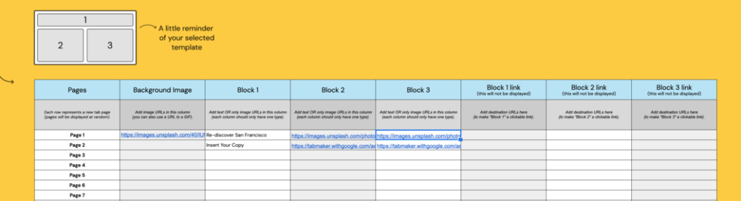 此时,Google Sheets 会自动为表格生成一个链接,我们需要将其复制并粘贴到 Tab Maker 页面下方的对话框中,让 Tab Maker 读取表格中输入的页面数据来生成相应的文字和多媒体内容。