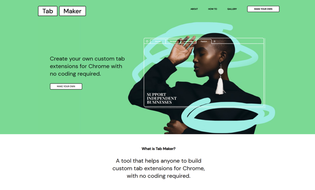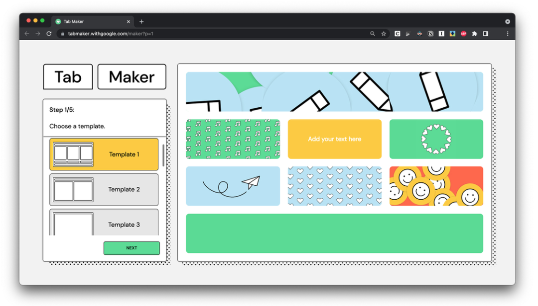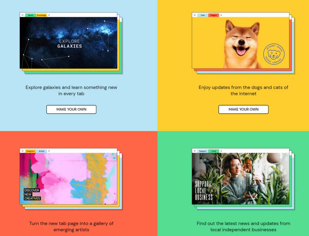 在 Google 的设想里,创建 Tab Maker 产品的初衷是为了在这个每天都有无数标签页被打开的时代里,让大家都能无门槛地利用这个平台去与他人分享自己的 idea 或是各种喜爱的事物,例如其给出的四个范例便包含在标签页中建立有关银河星系的画廊来探索学习银河系的奥秘、查看网络上各种可爱的猫猫狗狗、欣赏新生艺术家的作品并获得灵感、从本地的独立商户获取最新的信息和近况等等。