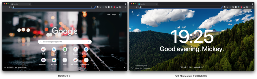因此市面上已经有了不少对新标签页进行美化或增强的第三方扩展程序,比如少数派介绍过的 Momentum、Infinity 等。这些新标签页扩展很多又会以「个性化定制」为卖点,我们在点开浏览器图标的同时,只属于自己的网络浏览体验就已经准备好了。