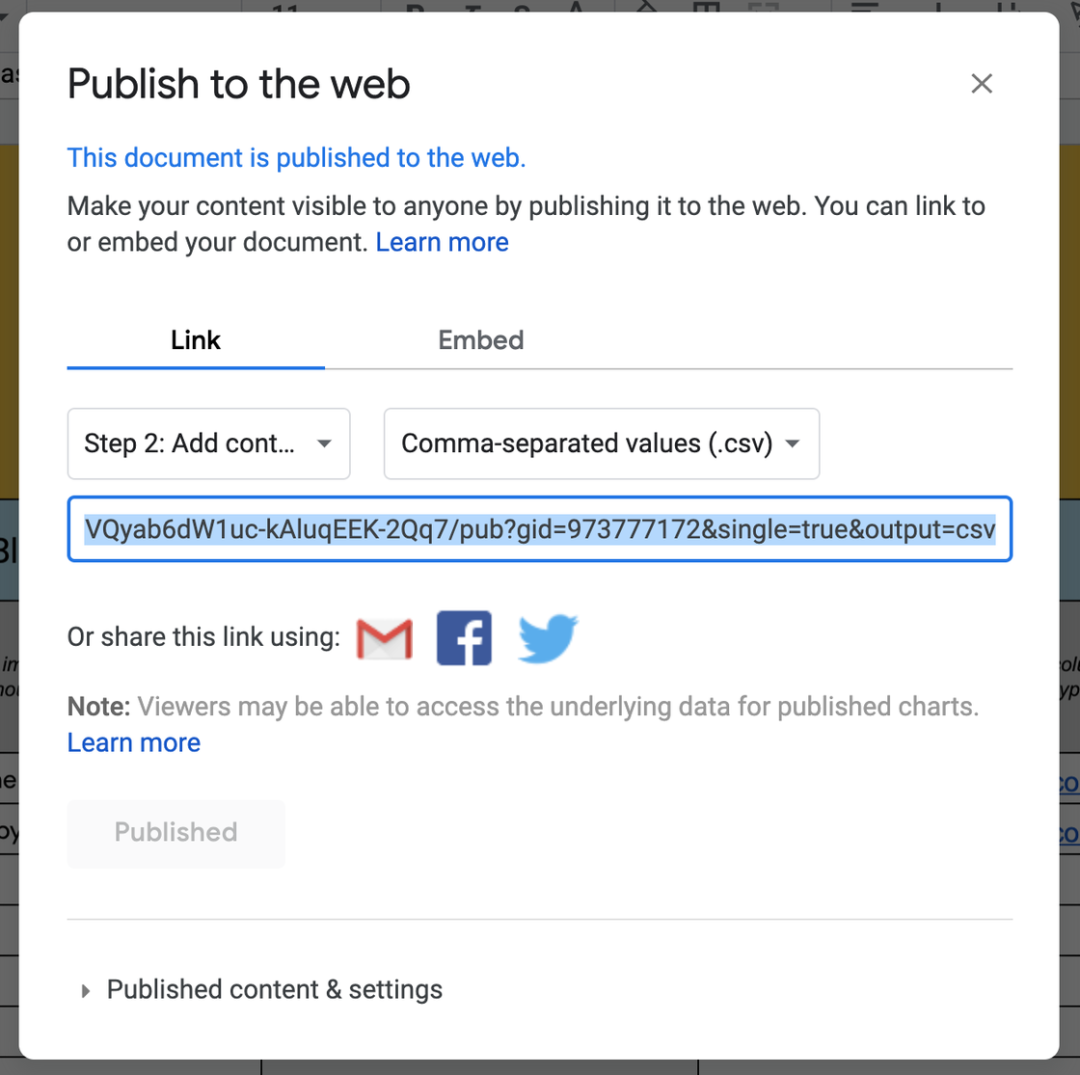 :依次点击左上角菜单 File > Share > Publish to web,并在弹出的对话框里的两个下拉菜单中分别选择第二份副表 Step 2: Add content to this sheet 和 .csv 格式 Comma-separated values (*.csv),最后点击发布(Publish)按钮即可。