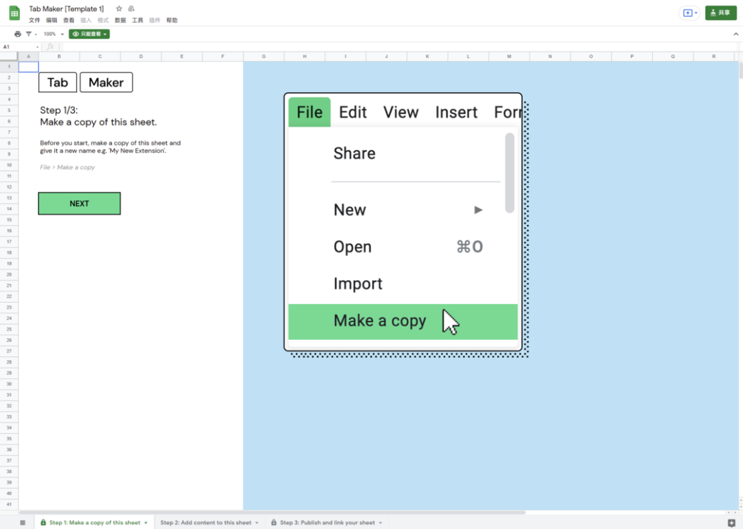 随后 Tab Maker 会引导我们创建一个用于页面内容搭建的 Google Sheet 表格模板。我们此刻需要做的是生成一份这份表格的副本,并将其保存到自己的 Google Drive 存储中。