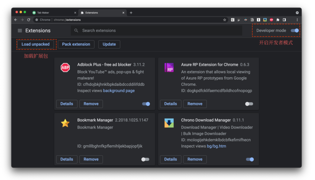 以 Chrome 为例:打开 Chorme 的扩展设置页面,开启开发者模式,然后点击加载扩展包,