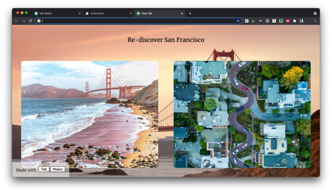 至于导出和使用,新标签页扩展制作完成后,Tab Maker 会自动生成一个包含扩展文件的压缩包文件供我们下载。我们可以将其安装进 Chrome/Edge 浏览器中来查看实际效果。