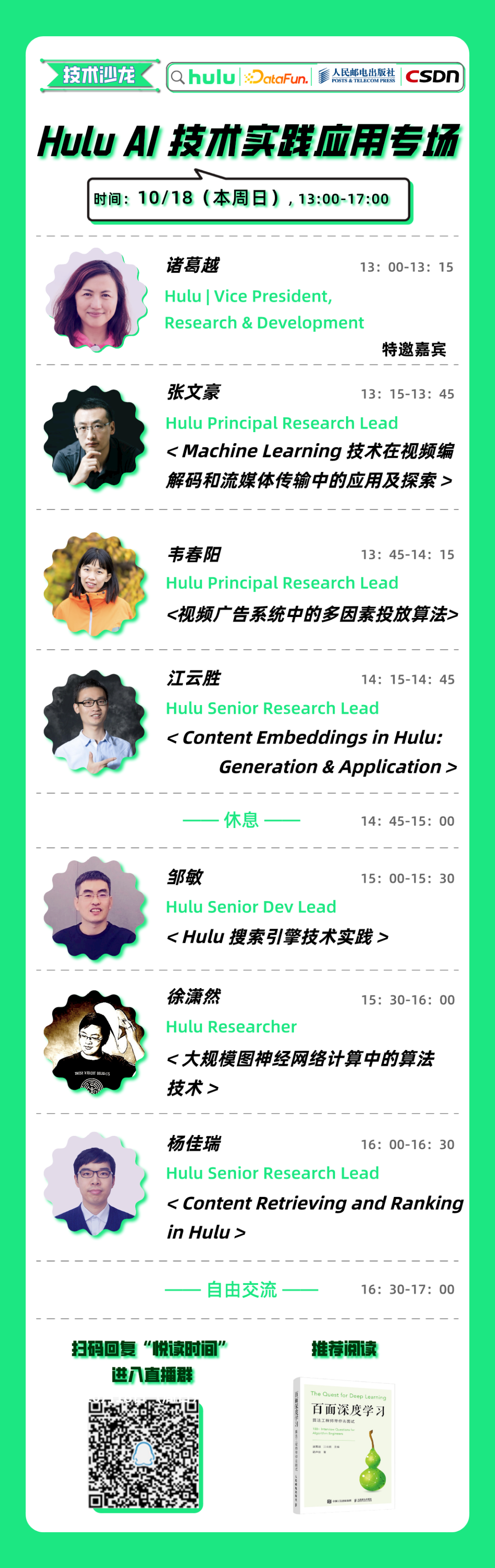 10月18日(本周日)13:00,《百面深度学习》作者、Hulu 算法研究员和算法工程师们就要跟大家线上见面啦!——“Hulu AI 技术实践应用专场”直播火热来袭!算法大牛与大家一起探讨机器学习算法在视频领域的应用等热点问题,在线分享交流,不容错过。