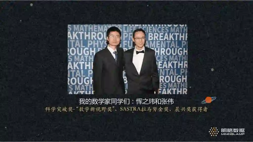 千禧年,我因奥数保送北大,北大2000级数学系已经有四位数学家了。照片中是其中的两位恽之伟和张伟,去年刚在美国拿下科学突破奖“数学新视野奖”。大家有没有听说过这个奖?很厉害的,有“科学界奥斯卡”之称,2013年由俄罗斯亿万富翁尤里・米尔纳设立,阿里巴巴马云及其夫人、腾讯马化腾、Google塞吉・布林、Facebook马克・扎克伯格夫妇,以及苹果公司董事长亚瑟・莱文森等知名企业家赞助。科学突破奖旨在表彰在生命科学、数学和基础物理学领域做出杰出贡献的科学家。有同学能够拿到这种奖,我也非常骄傲。数学界没有诺贝尔奖,最高奖项叫菲尔兹奖,第二高的叫拉马努金奖。这两个同学都已经得了SASTRA拉马努金奖,号称中国菲尔兹奖的晨兴奖也都拿了,我认为他们将来应该都能拿菲尔兹奖。真的,我很荣幸能够跟他们成为同学。