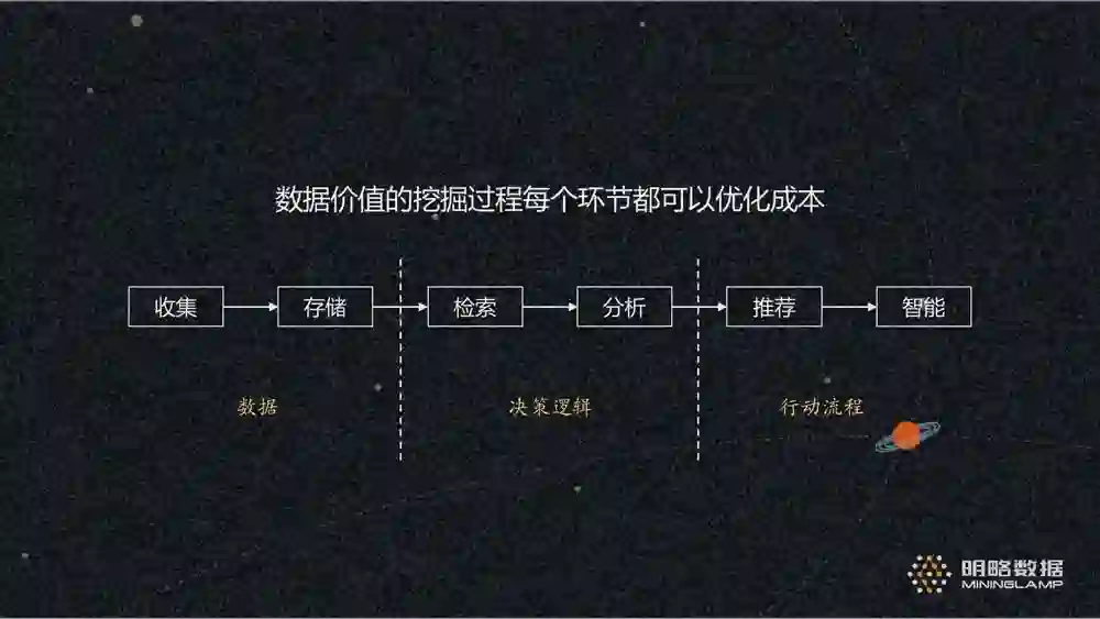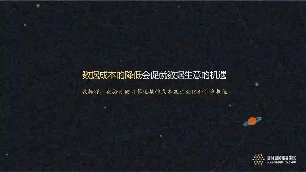 那明略所面对的这个数据的机会的是什么呢?我刚刚讲了,就是摄像头等,各种各样新的数据源的诞生。其实里面还有一个机会是什么呢?就是这些数据之前是四分五裂、没有联系的。互联网本来就是四分五裂的,后来因为有百度、有谷歌,把这些信息都联起来了,有超级链接把大家都联起来了,那今天移动互联网仍然也存在这个问题,不知道将来谁能彻底解决这个问题。这些都是机会,谁能够把这些数据联起来,降低人使用这些数据成本。降低数据成本方法有很多,一个数据本身产生储存有成本,数据的使用,挖掘的过程也有成本。