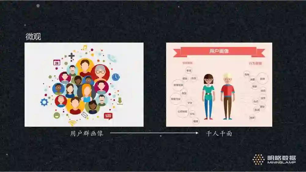 我刚才举了一个统计层面的数据,微观层面的比较就更多了。比如说精准营销,上午大家都讨论了,人群画像靠不靠谱,千人千面投不同的广告靠不靠谱。其实包括我们去抓坏人这件事情,也是一个微观的事情,要微观分析这个人是好人还是坏人,它也有很多价值,这里面也是减少试错成本。为什么?我走在大街上看到每一个人都像好人,警察不是,警察走在大街上看到每一个人都像坏人,我爸爸原来就是警察,他经常一眼能看出一个人是坏人,但是有时候他判断会出错的,数据分析可以帮助他验证一下,数据可以帮他证伪的。中国警力是远远不够的,又有很多案子要处理,只能先处理那些大案要案。所以你能通过数据帮他证明一个人是好人或者是坏人,这个时候就帮他减少出警的成本,对他的价值是很大的,他一个人可能就顶三个人了。这个和我们精准营销的道理是一样的。同样的广告费能不能给更多的目标群体。所以本质上明略和秒针的生意是一回事。