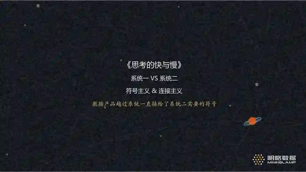 系统一是通过人的直觉系统,通过人的感知系统,把外界信号翻译成数据或者叫符号。什么叫符号?人类的文字就是符号,数字也是符号,这些都是符号。我相信大家现在绝大多数的公司肯定都在做人工智能相关产品。人工智能在发展历史上其实有两个重要学派一个叫符号主义,一个叫连接主义。现在的深度学习就是连接主义。大量的工作其实是符号主义相关的工作,像知识图谱,逻辑推理,机器推理这些东西。