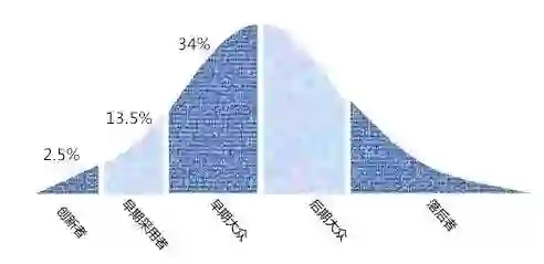 而且企业级市场很有意思的,它有一个学习链。有一本书叫《跨越鸿沟》,讲了一个市场拓展的曲线,整个市场如果是100%,头2.5%叫创新者,这些人是有什么新的东西他都敢试的,他不怕试错。后面13.5%叫做早期采用者,这些人是看了那些创新者一旦用了他觉得不错,挺好的,他也过来买一件。再后面34%,这一类人叫早期大众,就是一个产品一旦遇到这个点的时候,一旦第三段的人都开始买了,这个产品就算爆品了。