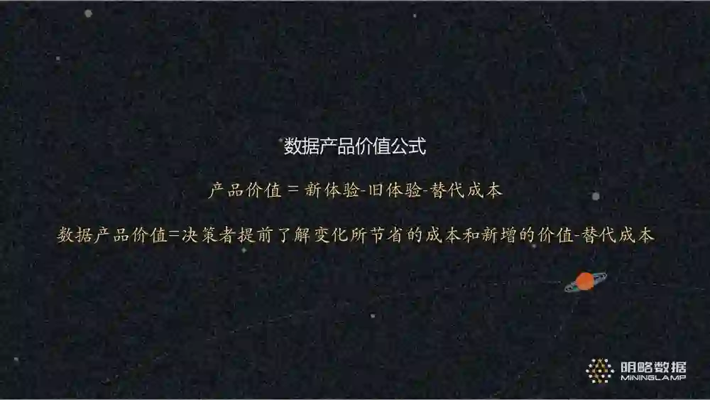 ▨ 数据产品的价值等于决策着提前了解变化所节省的成本和新增的价值再减去你的替代成本。