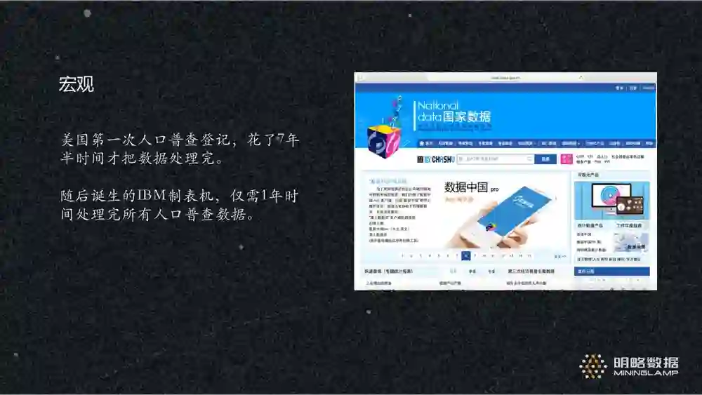 宏观,比如说国家每年都要做人口普查。整个IT产业之所以能发展起来,其实就是因为人口普查,当年美国做人口普查的时候花了很多钱,他是请了几百名骑警,拿着打卡器,路上看到一个人按一下,把美国所有的地方都跑一遍。大概花多少时间呢?七年,就统计了一下美国到底有多少人。