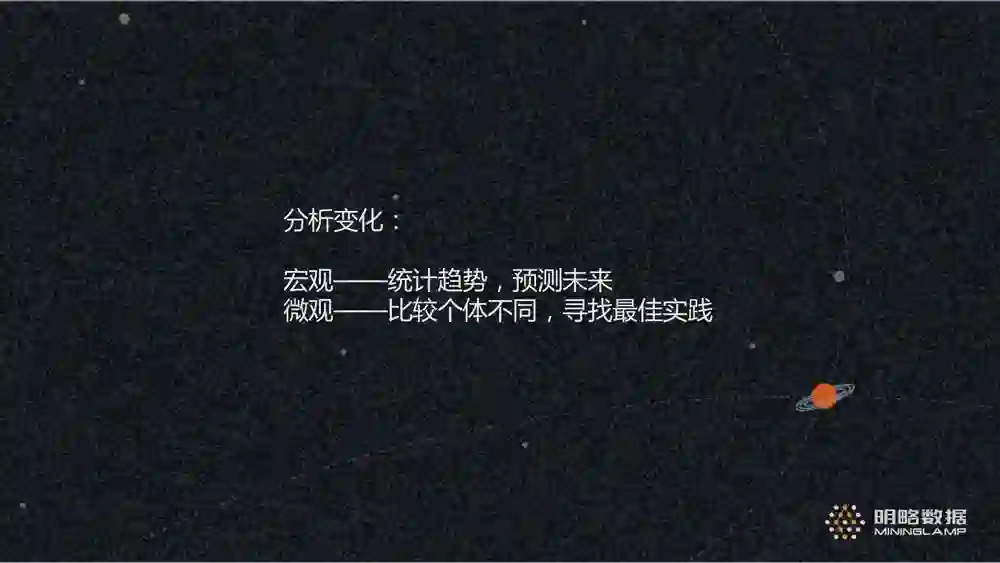 分析变化里面你既要分析宏观变化,也要分析微观变化,宏观变化就是我刚才讲的通过观察宏观趋势是可以预测未来的,但是你也别指望它能够预测很久的未来,只能预测短期未来,因为未来是不确定的,随时都有可能会出来一个新的参数。举个例子比如说国家政策调整对于地产行业。前面做得再好都没有用,随时都可能产生一个新的参数你怎么可能预测呢?但是特别短的时间可以做这件事情。微观价值是什么呢?这里面特别重要,我给大家好好讲一下,微观的价值是用于比较的,我们需要按照各个不同维度去细分,细分到最下面然后去看个体和个体比较,这些比较一旦比出来就会发现这里面有最佳实践,大家应该都听说过一个故事: