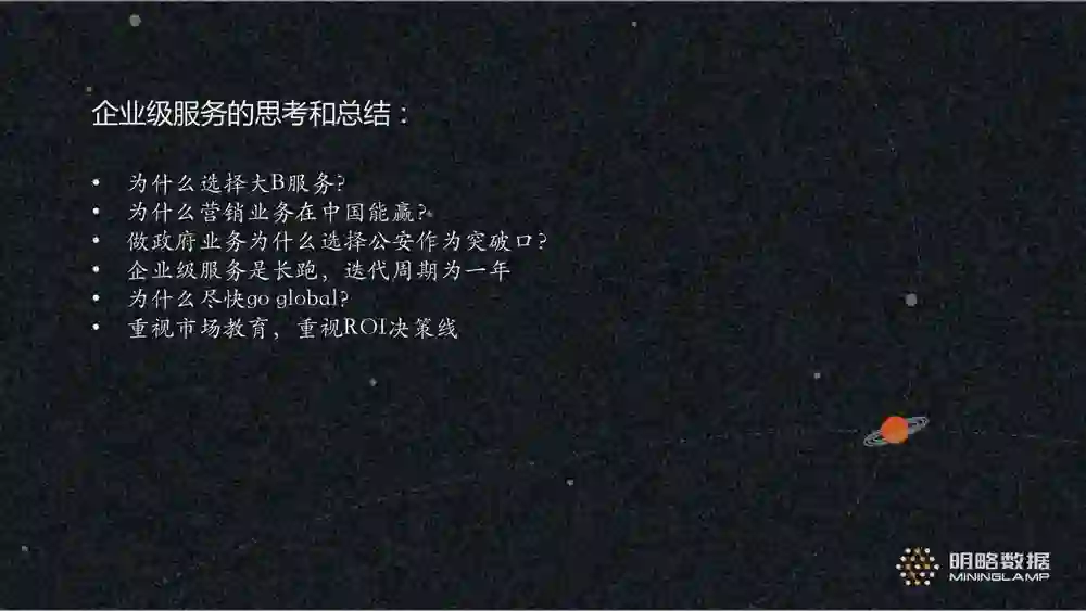 所以我最后稍微用两页总结一下,第一个就是我自己做了很多企业级的服务,我自己投资了很多企业级服务,这里面有几个关键的问题,第一个就是为什么选择大B服务,我刚刚给大家讲了,大B服务其实才有钱,那个场景有价值,小B服务根本没钱付你。