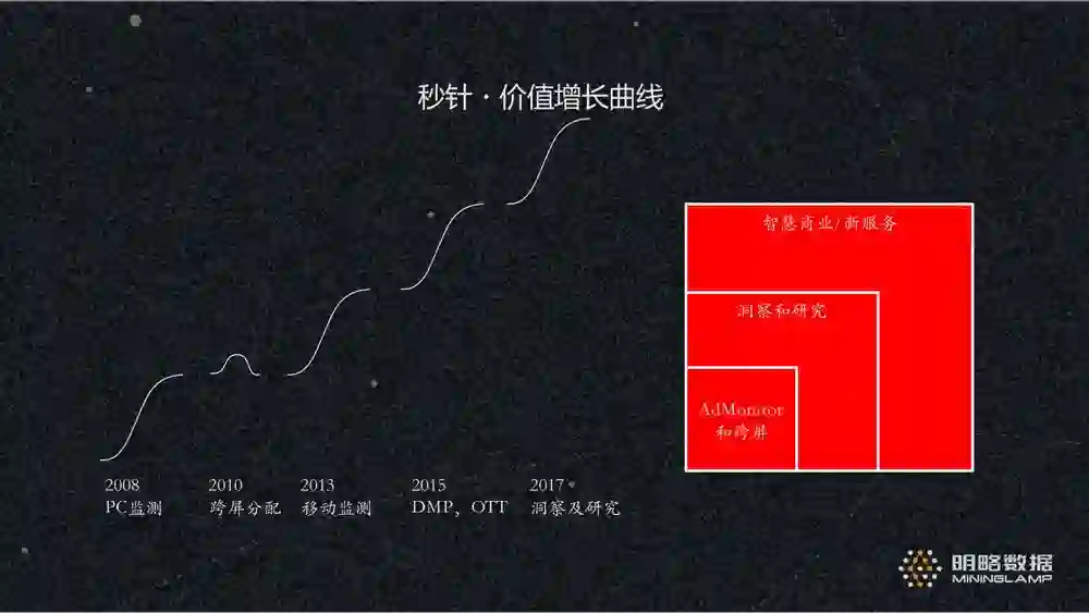 这个是秒针的价值增长曲线。我刚才讲数据产品的价值是跟它所面对的场景的规模、场景的价值不断变化的。秒针历史上的市值在不断上涨,就是因为所在场景的价值越来越大。从第一天我们做的是一个产品叫AdMonitor,帮客户去监测互联网广告,这是在2007、2008年开始做的这个产品。后来我在2009年的时候参加一个会,碰到一个老外,这个老外我到现在都找不到他,但是我特别感激他,他是我人生里面重要的贵人。他给我画了这么一个框,说你们做的这个事情特别牛。其实秒针不是第一家做这件事情,市场上已经有一家公司叫Double Click。这家公司后来被谷歌30亿美金给收购了。那这家公司其实是全世界最早的做广告分析,互联网广告分析的,而且以监测Click为主。那我们当时跟它做的事其实是一样的,但误打误撞多做了一件事情,因为Double Click出来得太早了,是1998年的公司,我们是2006年底成立,2008年才做这块业务,已经是它十年之后了。十年之后发生了一个什么重要的事情?就是摩尔定律,硬件成本在不断下降。在十年之前,它只敢在服务器上存Click的数据。大家都知道一个广告,它在互联网上第一步先是展示,第二步才有可能点击的,展示是点击的多少倍呢?今天展示是点击差不多一千倍,平均一千次展示才会有一次点击,那个时代相对点击率是高的,一百倍,因为那个时候大家都没啥可以点的。但是即使一百倍十年前也太贵了,服务器太贵了,应用太贵了,没有人敢存这么多数的,因为数据真的很大,我们的这个数据硬盘不停的都在加,很贵的,一天是大几个T的原始日志的。从第一天上线数据量就很大。Double Click所以那个时代它就只存Click,而秒针我们就属于胆子大的,从第一天都不知道那个数能干嘛呢,就先把它保存了,曝光的日志都存下了,也就是说一千倍的那个数都存下了。因为当时确实有机会存了,确实越来越便宜了,硬盘便宜了。