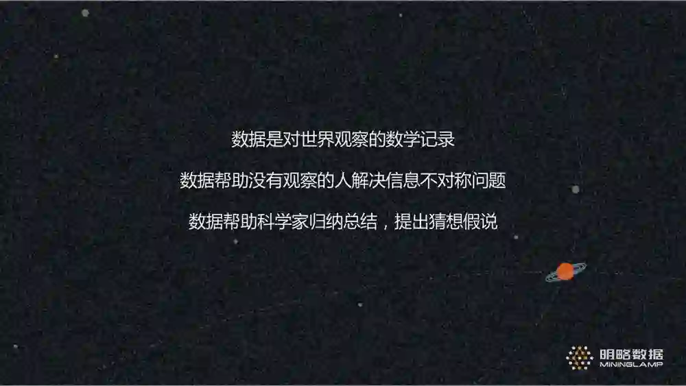 因为每个人的时间都是有限的,你没有时间去观察星星,我看完记录下来,等到开普勒需要计算的时候,把数据拿出来给他。再举个例子,大家做金融风控,看一个家庭有没有还钱的能力,以前你没有时间和精力去看每一个家庭,今天有了大数据分析,基于这个数据表现出来他有能力还款,所以我可以贷款给他。每个人都需要信息、数据解决类似问题,数据可以做很多事情,可以帮助科学家归纳总结、可以提出猜想假说,这是数据的价值。