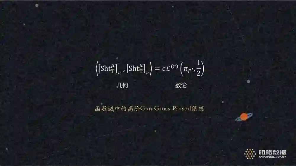 能够拿那么高级的奖,他们研究的课题是什么呢?给大家看个公式,这个公式证明了一个很牛的猜想,函数域中的高阶Gan-Gross-Prasad猜想,它连接了数论和几何的两个量,几乎打破了这一领域30年来的毫无进展,为数学界著名的7个千禧年问题中的3个问题推出了诸多的解题可能性。