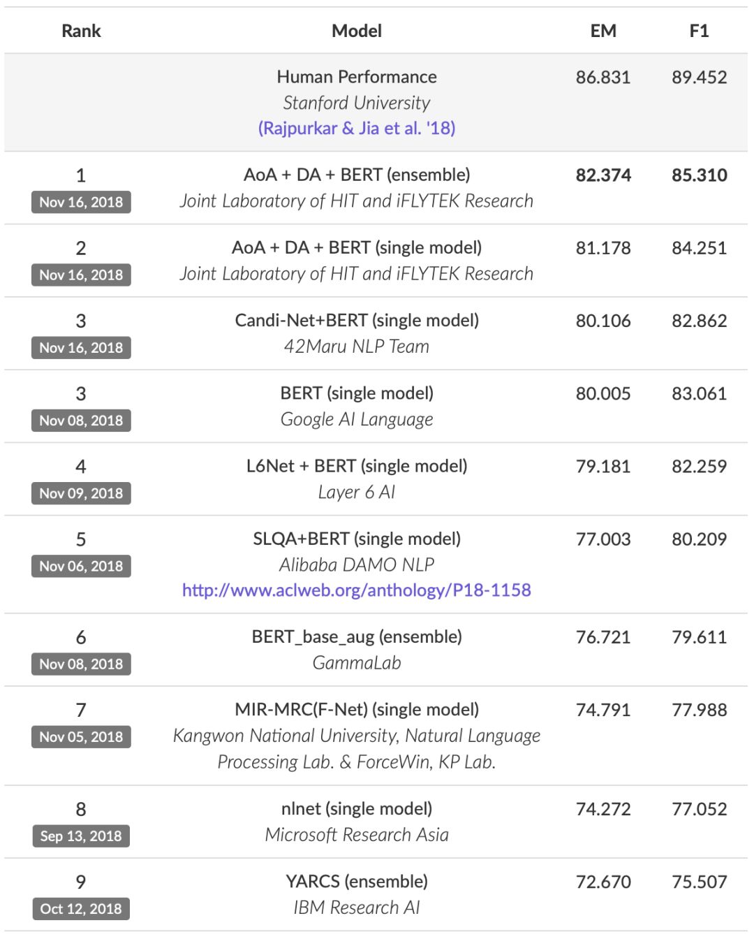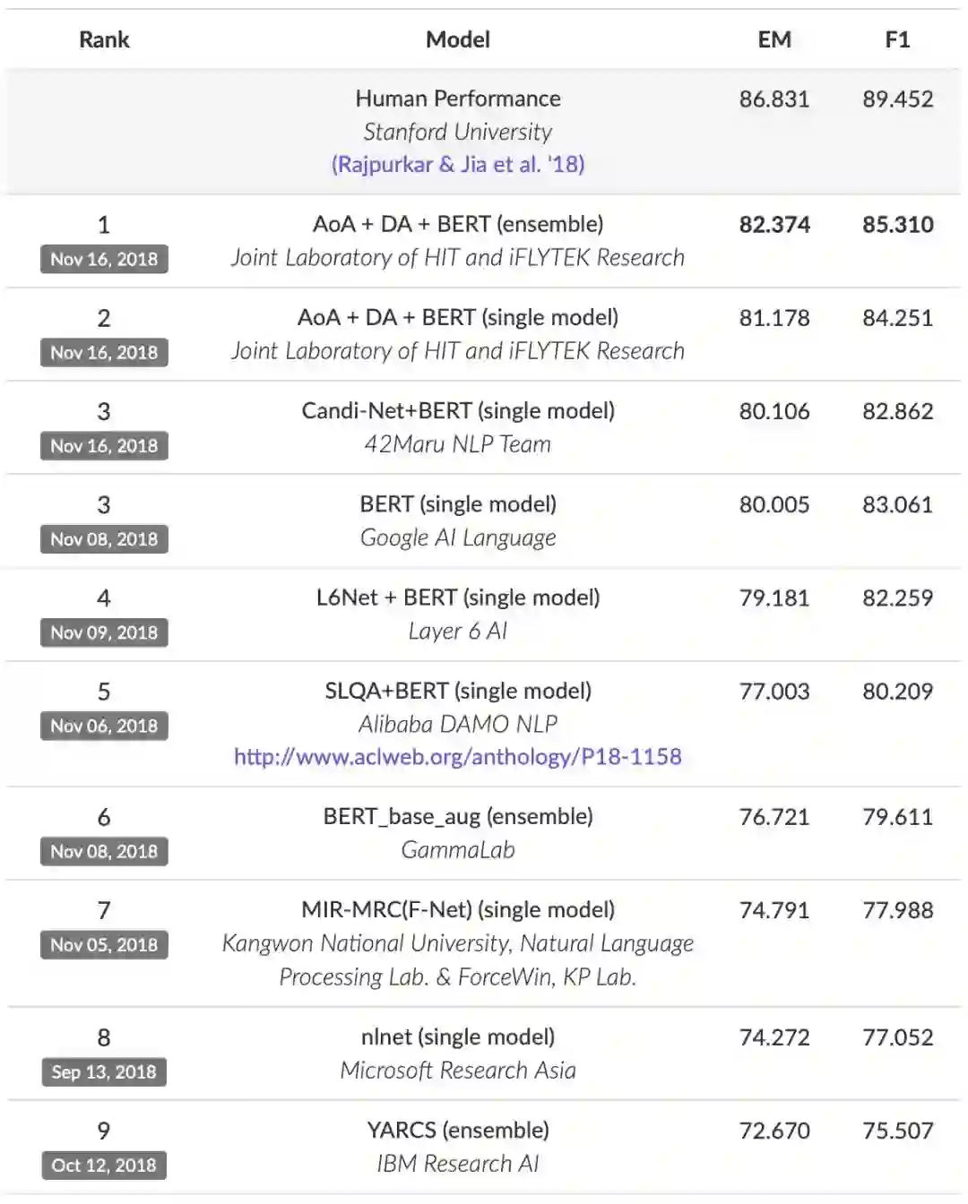 哈工大讯飞联合实验室(HFL)首次在SQuAD 2.0评测中提交系统,并且凭借AoA+DA+BERT模型将两项评测指标提升到新的高度,其中EM指标(精准匹配率)达到82.374,F1指标(模糊匹配率)上达到85.310,进一步缩小与人类在该数据集上的效果差距。同时,本次提交的单模型系统效果显著优于同期其他机构提交的模型。由斯坦福大学发起的SQuAD评测自2016年以来受到了业界广泛关注,吸引了众多国内外知名研究机构和高校,其中包括谷歌、阿里巴巴达摩院、微软亚洲研究院、IBM研究院、复旦大学、国防科学技术大学等。