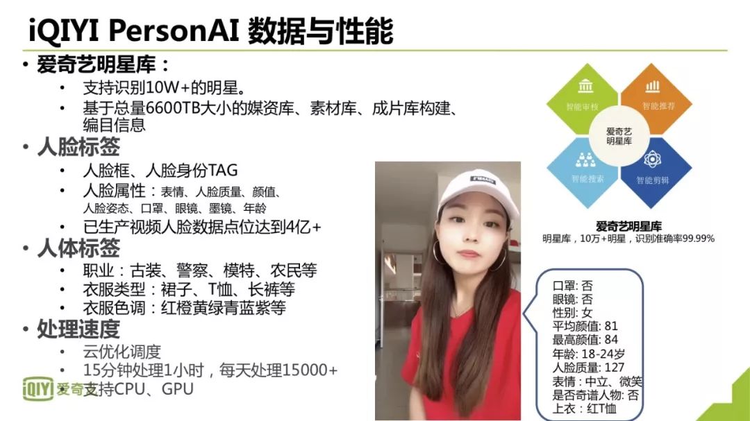 演讲介绍了爱奇艺视频人物识别技术背景及挑战,视频人物身份识别受视频质量、人物服饰、姿态、遮挡等多方面因素影响,同时还需要较高的时效来处理海量数据;爱奇艺在模型优化、多任务分类检测、人体身份及属性识别、ReID等方面取得的技术成果,视频人物分析的关键技术上遇到的一些挑战及应对方案及爱奇艺身份识别的相关产品应用。
