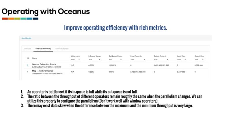 Oceanus 对正在运行的作业采集了大量的指标,通过这些指标来监控作业运行情况,并在发生故障时定位原因。为了提高运维效率,我们根据长期积累的经验对运行指标进行了筛选,并对 Flink UI 进行了重构来合理展示这些指标。