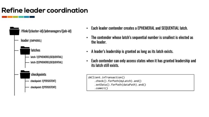 Zookeeper 的实现保证了创建的 latch 节点的序列号是递增的。所以如果一个 master 节点被选为 leader 之后,只要它的 latch 节点仍然存在,就意味着它的序列号仍然是所有 master 节点中最小的,它仍然是集群中的 leader。从而我们就可以通过检查一个 master 的 latch 节点是否存在来判断这个 master 是否已经丢失 leader。通过将 leader 地址的发布以及对 checkpoint 的修改等更新操作和对 latch 节点的检查放置在一个 Zookeeper 事务中,我们可以保证只有保有 leader 的 master 节点才可以对作业执行状态进行修改。