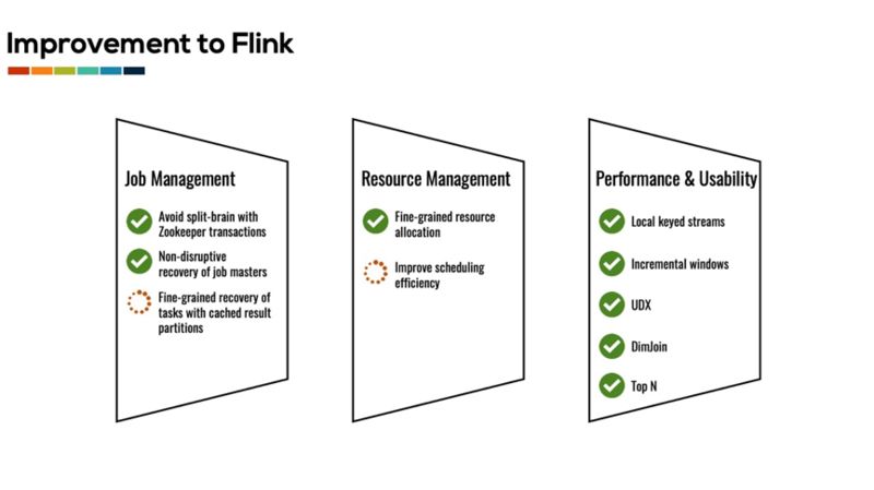 作业管理相关:我们对 Flink 的作业管理的改进主要以提高作业执行的可靠性为主,包括对分布式环境下的 leader 选举的重构和无需作业重启的 Job Master 恢复机制等。同时,我们也正在研究和开发细粒度恢复机制来减少发生故障时需要重启的 task 数目。