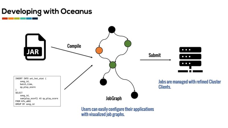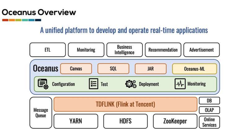 为了提高用户流计算任务持续集成和持续发布的效率,实时计算团队从 2017 年开始围绕 Flink 打造了 Oceanus (http://data.qq.com),一个集开发、测试、部署和运维于一体的一站式可视化实时计算平台。Oceanus 集成了应用管理、计算引擎和资源管理等功能,提供了三种不同的应用开发方式,包括画布,SQL 和 Jar,来满足不同用户的开发需求,同时通过日志、监控、运维等周边服务打通了应用的整个生命周期。