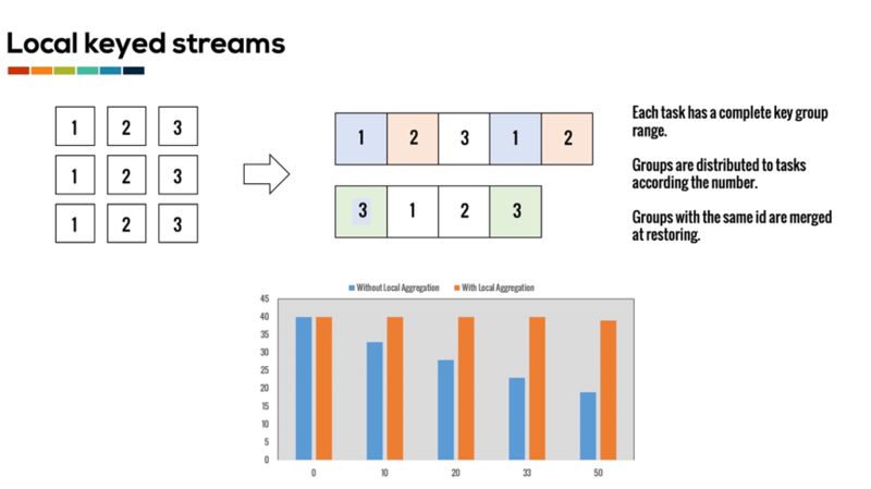 但 Local keyed streams 的数据划分和分发和 keyed streams 不同。在 keyed streams 中,数据流会划分成多个 key group,每个 task 都会负责一部分 key group 的处理。每个 task 之间的 key group 是没有任何交集的。而由于 local keyed streams 是在 task 本地对数据流进行划分,因此每个 task 上的 key group range 都是 key group 全集。即如果数据流总共有 3 个 key group,那么每个 task 的 local key group range 都为 [1, 3]。