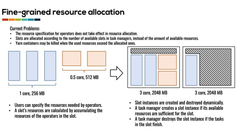 这种资源分配的方式也会导致较严重的资源浪费。在实际中每个算子所需的资源使用量是不同的。有的算子需要较多的 CPU 资源,而有的算子需要较少的内存资源。由于现在的配置中所有 task executor 具有相同的 slot 数目,所有 slot 都具有相同的资源,因此导致较为严重的资源碎片,无法充分利用集群资源。