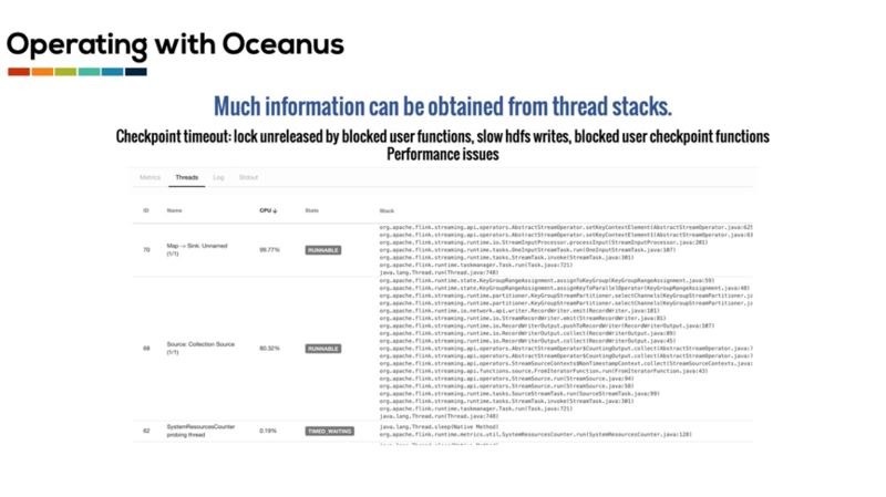 在即将发布的新版 Oceanus 中,我们还对 TaskExecutor 的线程信息进行了采集。这些线程信息能够很好地帮助用户定位发生的问题。例如 checkpoint 可能会由于多种多样的原因而超时。当用户实现的 source function 在被 IO 或者网络堵塞时并没有释放 checkpoint 锁,那么正在执行的 checkpoint 可能就会由于无法及时获取锁而超时。用户也有可能实现了一个堵塞的 checkpoint 函数,由于较慢的 HDFS 写入或者其他原因而导致 checkpoint 超时。通过观察线程信息,我们就可以容易的知道 checkpoint 超时的原因。