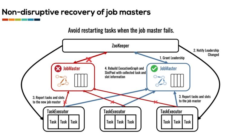 在另一边,task executor 在丢失了和 master 节点的连接之后,也不会立即杀死这个 master 负责的 task。相反,它将等待一段时间来发现新 master 的地址。如果在这段时间内发现了新 master 的地址,那么 task executor 将把其执行的 task 的信息汇报给新 master。