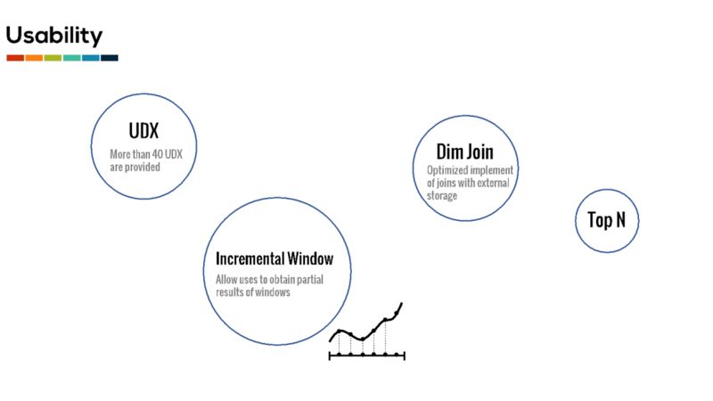 为了方便用户开发画布和 SQL 程序,我们实现了超过 30 个的 Table API 和 SQL 函数。用户可以利用这些内置函数极大地提高实时计算应用的开发效率。此外,我们也对数据流和外部维表的 join 进行了大量优化,并补充了 Flink 还未支持的 Top N 功能。我们还提供了 incremental window 功能,允许用户能够在窗口未触发时得到窗口的当前结果。Incremental window 在多个应用场景中有着广泛的应用。例如用户可以利用 incremental window 统计活跃用户数目在一天内的增长情况。
