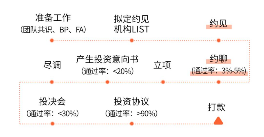 从图中我们发现,原来融资包含这么多环节,但更让人惊讶的是,绝大多数的创业项目在“与投资人约聊”时就已阵亡,根本等不到后续。