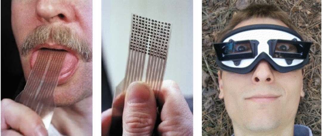 左图:舌显象装置(Maris 和 Bach-y-Rita,2001;图片:Kaczmarek,2011);右图:“倒置眼镜”,最初由 Erismann 和 Kohler 构思于 1931 年。(图片:维基百科 Upside down goggles)
