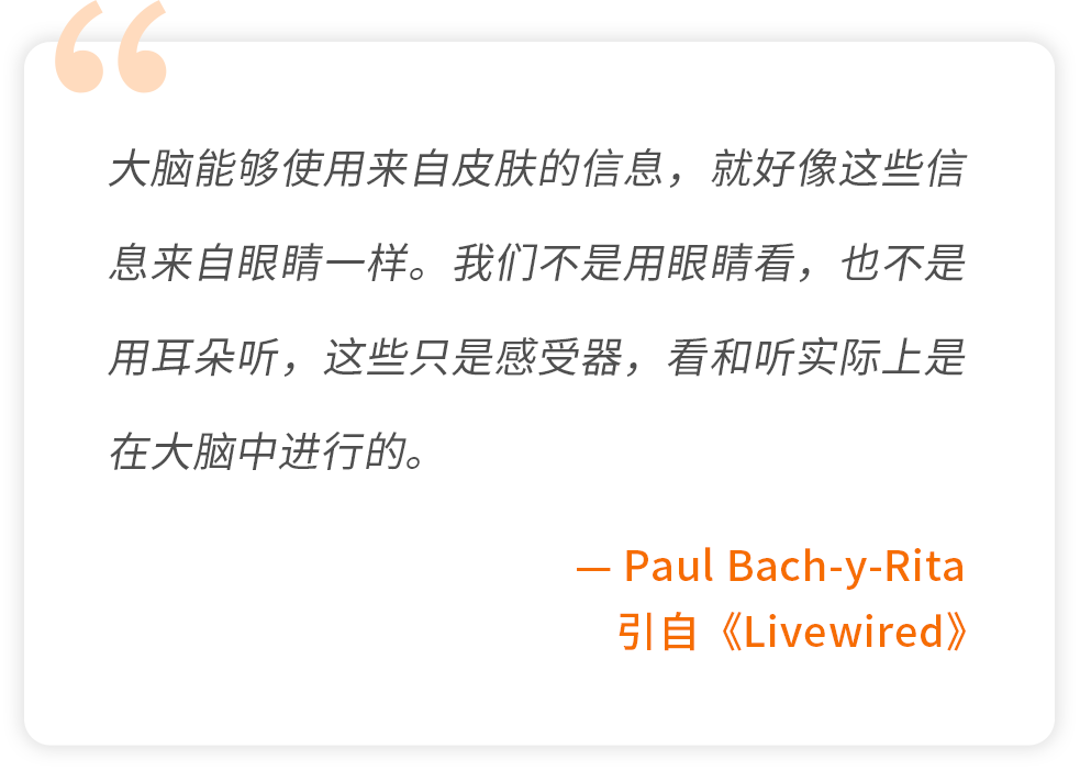 人类有一种很神奇的能力,可以使用一种感官方式(比如触摸)来提供通常由另一种感官(比如视觉)收集的环境信息。这种适应性能力,被称为感官替代 (Sensory substitution),是神经科学领域一个很有名的现象。一些有难度的适应,例如适应上下颠倒着看东西、学习骑乘“反转”自行车,或学习通过解读放置在舌头上的电极网格发射的视觉信息来“看”,可能需要几周、几个月甚至几年的时间才能掌握,但无论多难,人们最终都能够适应感官替代。