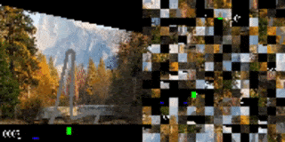 我们将来自 CarRacing 的视觉输入分成由小图块组成的二维网格,并打乱其顺序。在没有任何额外训练的情况下,即使原始训练背景(左)被新图像(右)替换,我们的代理仍然可以运作