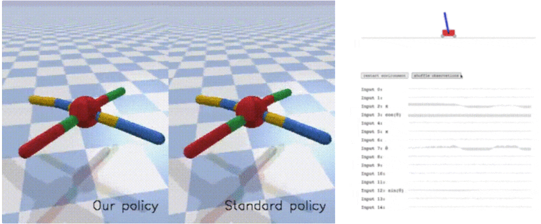 置换不变强化学习代理,适应感官替代。左图:Ant 的 28 个观察的顺序每 200 个时间步随机重排一次。与标准策略不同,我们的策略不受突然置换的输入影响。右图:给定大量冗余嘈杂输入的 Cart-pole 代理(互动式网络演示)