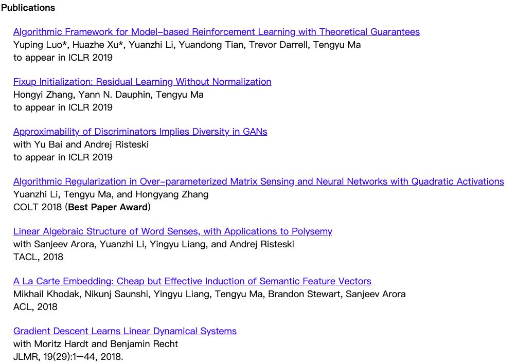 在普林斯顿读博期间,马腾宇师从 Sanjeev Arora 教授,已在国际顶级会议和期刊上发表高质量论文近 20 篇。