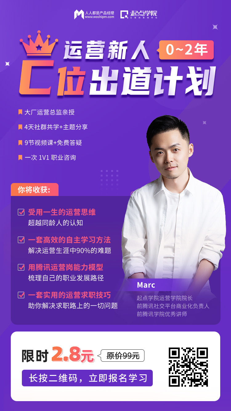 因此,“人人都是产品经理社区”旗下起点课堂,联合腾讯课堂请到了潘至鹏老师,带来为期4天的训练营——《0~2岁运营新人·C位出道计划》