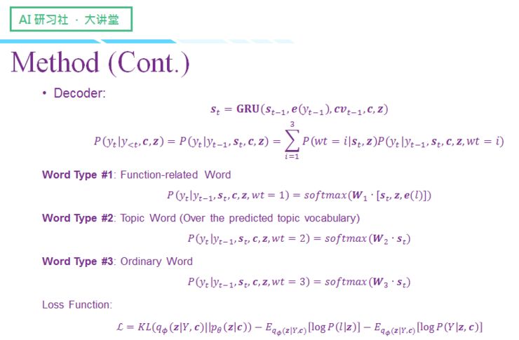 最后我们再来回顾一下整个模型,这个模型会产生 loss 的地方主要有三点:第一点是最终生成的 response 与给定的 response 之间的交叉熵;然后在对 z 做分类时,判断当前类别与我们设定的类别是否一样,中间也会存在一个 Loss;第三个点是为了拉近识别网络与先验网络产生的分布距离,我们设置了一个 KL 项,在这过程也会产生 loss。