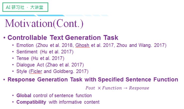 我们的工作涉及到可控对话生成和可控文本生成的任务,也就是说给定一个属性值,生成的语言必须和这个属性值相匹配,目前学界做的较多的是跟情绪相关的研究,比如设定一个情绪「喜欢」,聊天机器人自动生成各种与「喜欢」属性相匹配的对话内容;还有一种更加粗线条的情感极性,主要分为「正向情感」和「负向情感」。另外还有一种与英语时态相关。还有人研究对话意图,让生成的对话能够符合事先设定的对话意图。也有人做「风格」相关的一些研究工作,不过这方面更多集中在图像领域,比如说风格迁移,就语言领域的研究来讲,这块还是处于比较初级的阶段(比如把对话风格统一调整为「男性」)。
