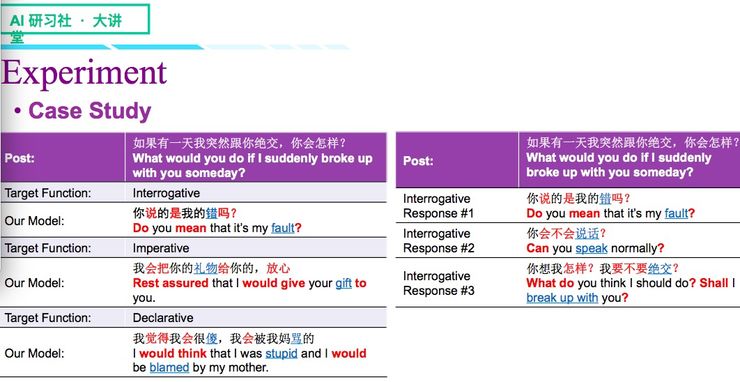 总结一下,在单轮对话里通过生成不同句式的回复来实现对话目的,这一点我们的模型已经做得比较好了。在初步具备控制能力的情况下,下一步我们需要做感知,即知道用户表现出什么样的状态,这样我们才能决定我们使用的句式、对话目的与策略,从而在多轮对话里生成较高质量的回复。目前我们的工作只做到了第一步,第二步相对来说比较有难度,因为涉及到的是用户行为的探测和感知。这个可以看做是我们工作未来发展的一个方向。