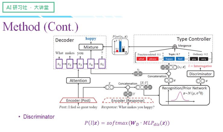 左边是对话领域中常见的「编码-解码」结构,该结构一般带有 attention,以增强 post 和 Response 间的对齐关系,然而仅仅只有这个结构,生成的结果肯定不是我们想要的,因此我们需要增加控制组件,让模型能够达到控制句式的效果。