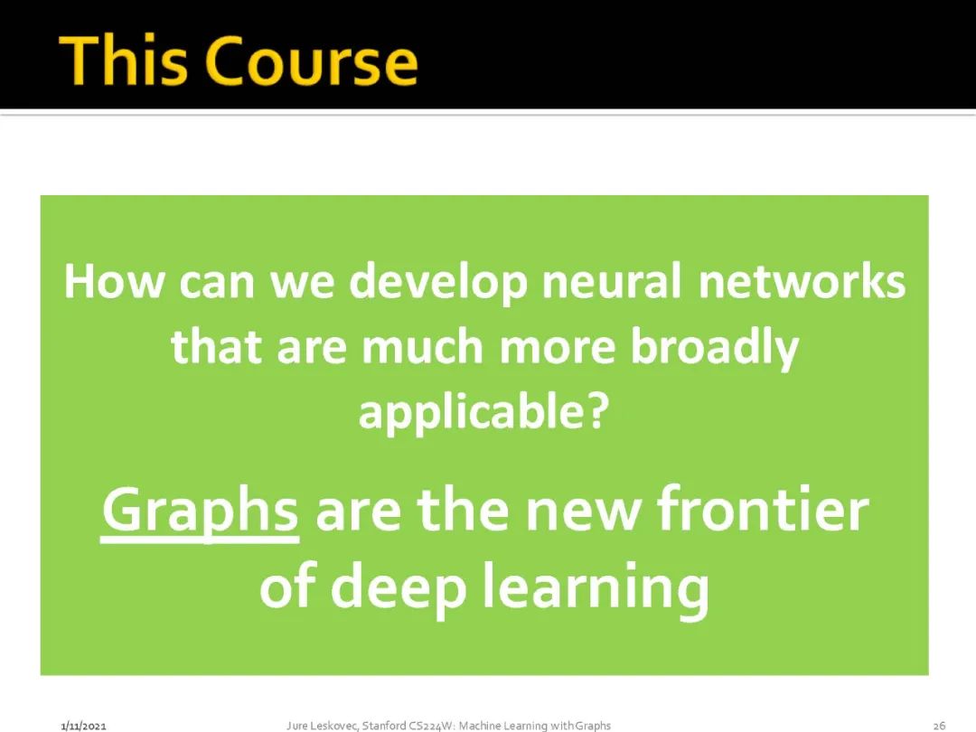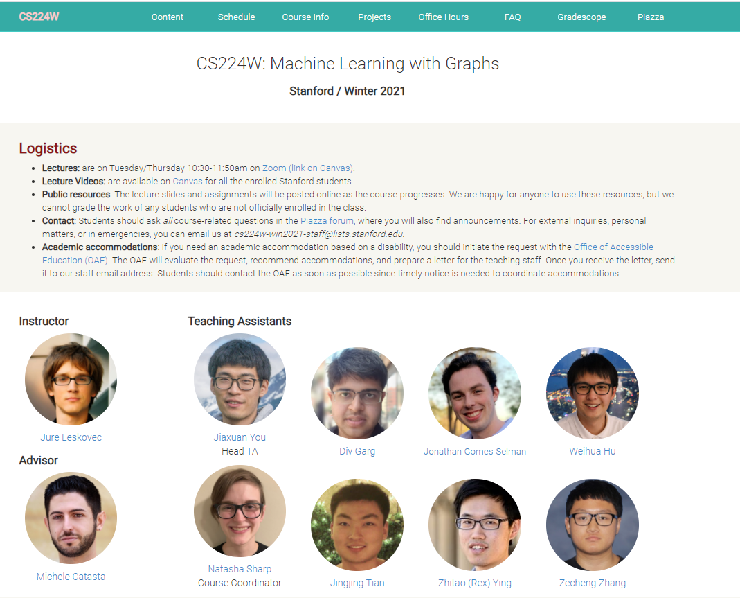主讲人是图网络领域的大牛Jure Leskovec,是斯坦福大学计算机学院的副教授,也是图表示学习方法 node2vec 和 GraphSAGE 作者之一。在谷歌学术搜索(Google Scholar)上,Jure拥有接近4.5万的论文引用数量,H指数为84。