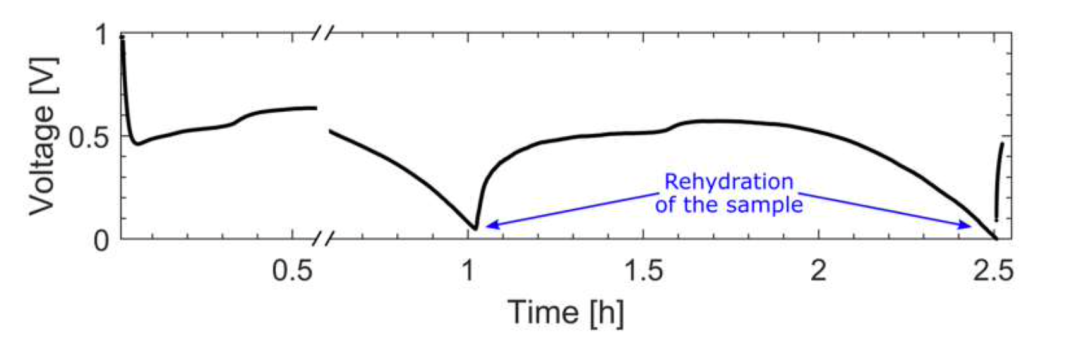 一小时后,单单元电池组的性能会因为纸张干燥而迅速下降。但是,如果再滴上两滴水,它就能再维持一个小时以上稳定的 0.5 伏工作电压。