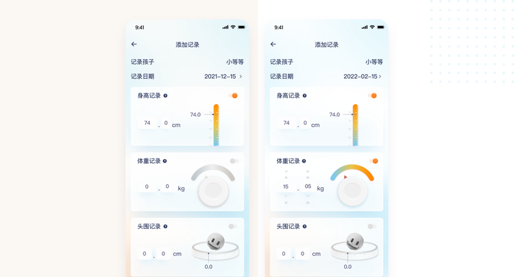 我们支持同时记录孩子的身高、体重、头围数据,当然你可以自定义需要记录的成长数据,当你需要记录某一个数据时,打开开关拖动数据即可。在记录的样式方面,我们也希望尽可能的传递直观的信息,所以选择了身高尺、体重称和软尺的样式,当你拖动左边的数据时,右边的刻度尺也会相应滑动。