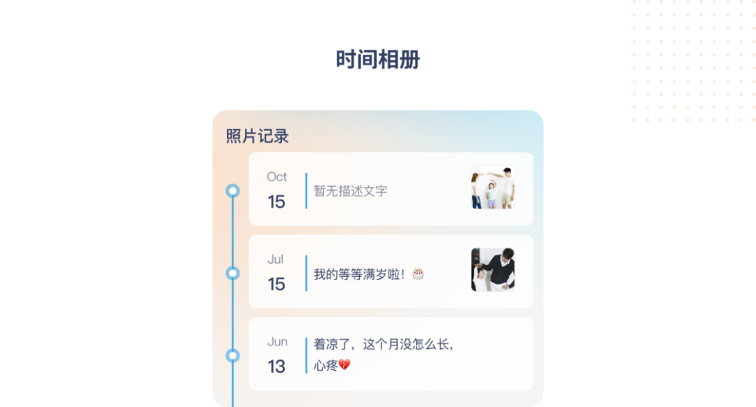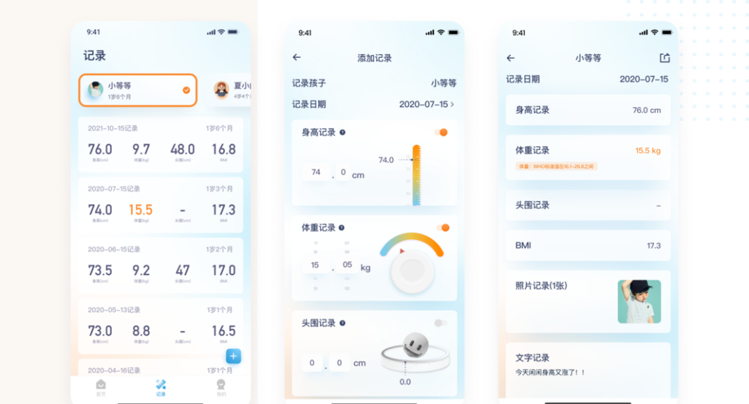 除了以上能够真正帮助家长更精准、更便捷地记录孩子的成长数据功能以外,我们同时也希望这个产品不光是一个冷冰冰的工具,更是一个温暖的产品。当你有一天回顾孩子的生长时,这里也有你们满满的温馨回忆,基于这个初衷,我们还做了下面的功能。